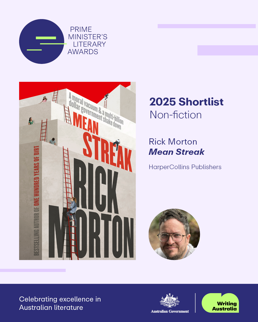 A few days after this news, my publisher Catherine Milne (who has put up with me a lot throughout the making of this book) emailed to tell me Mean Streak had been shortlisted in the non-fiction category for the Prime Minister's Literary Awards 2025 and I almost had a little fit. The biggest lit prize in the country and my awful baby is on it. I say awful because I both hate it and am proud of it, never clearly one or the other. So to read the judges' comments, below, was especially clarifying.