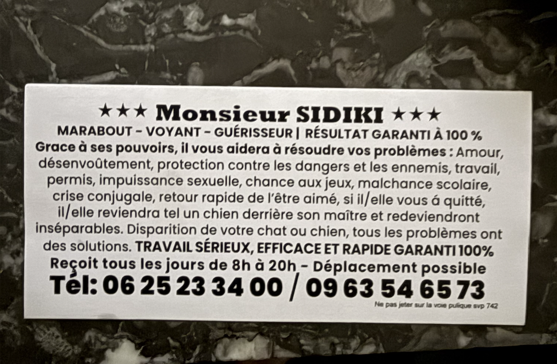 A card arrived in the mailbox the other day from a Mr Sidiki, offering a compelling range of services that I didn't even know I needed. He's a sort of handyman, I gather, although his gifts are many and best categorised under 'seer'. Translating, he offers: