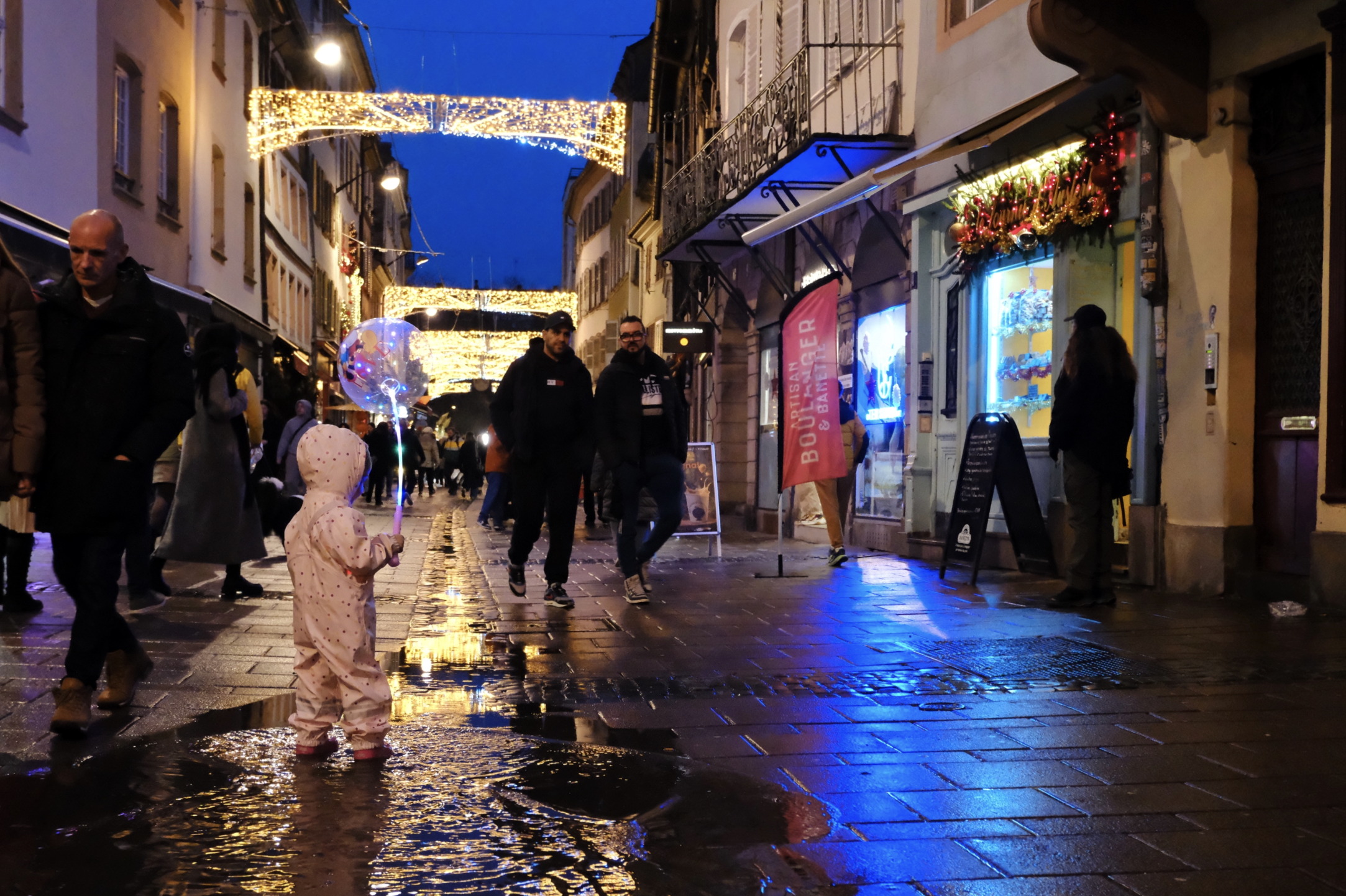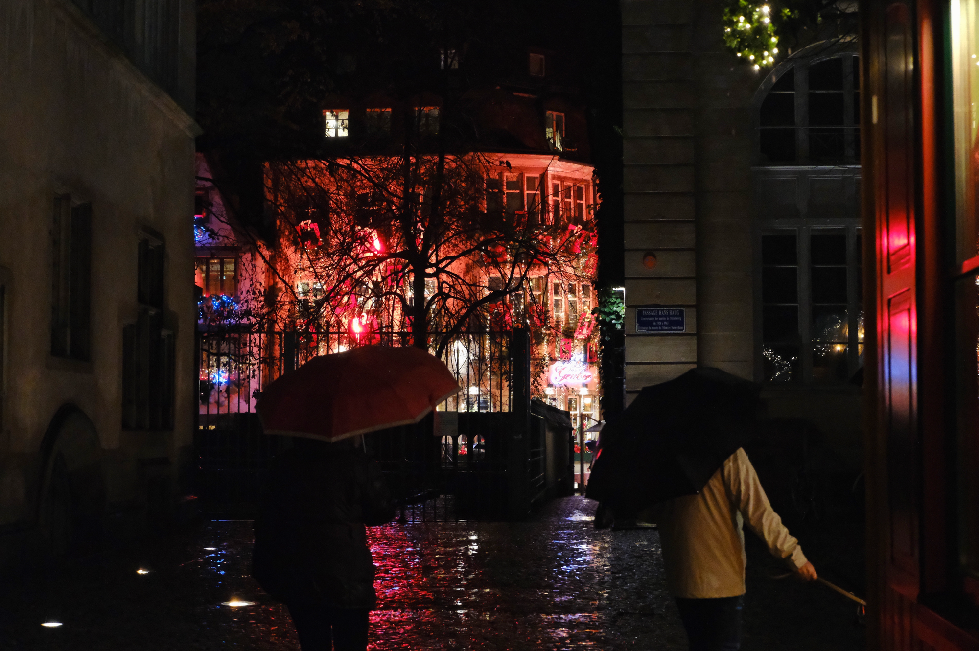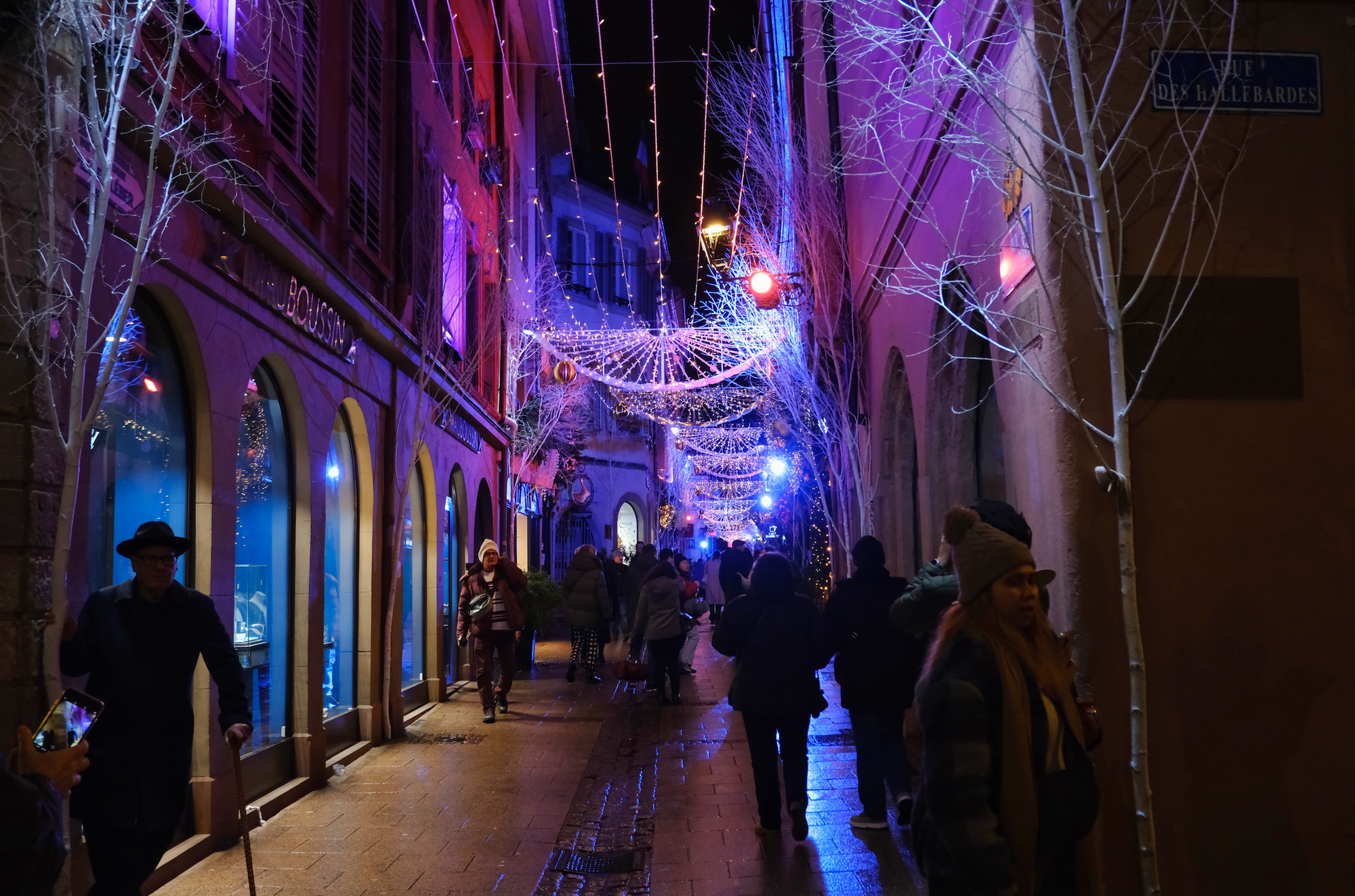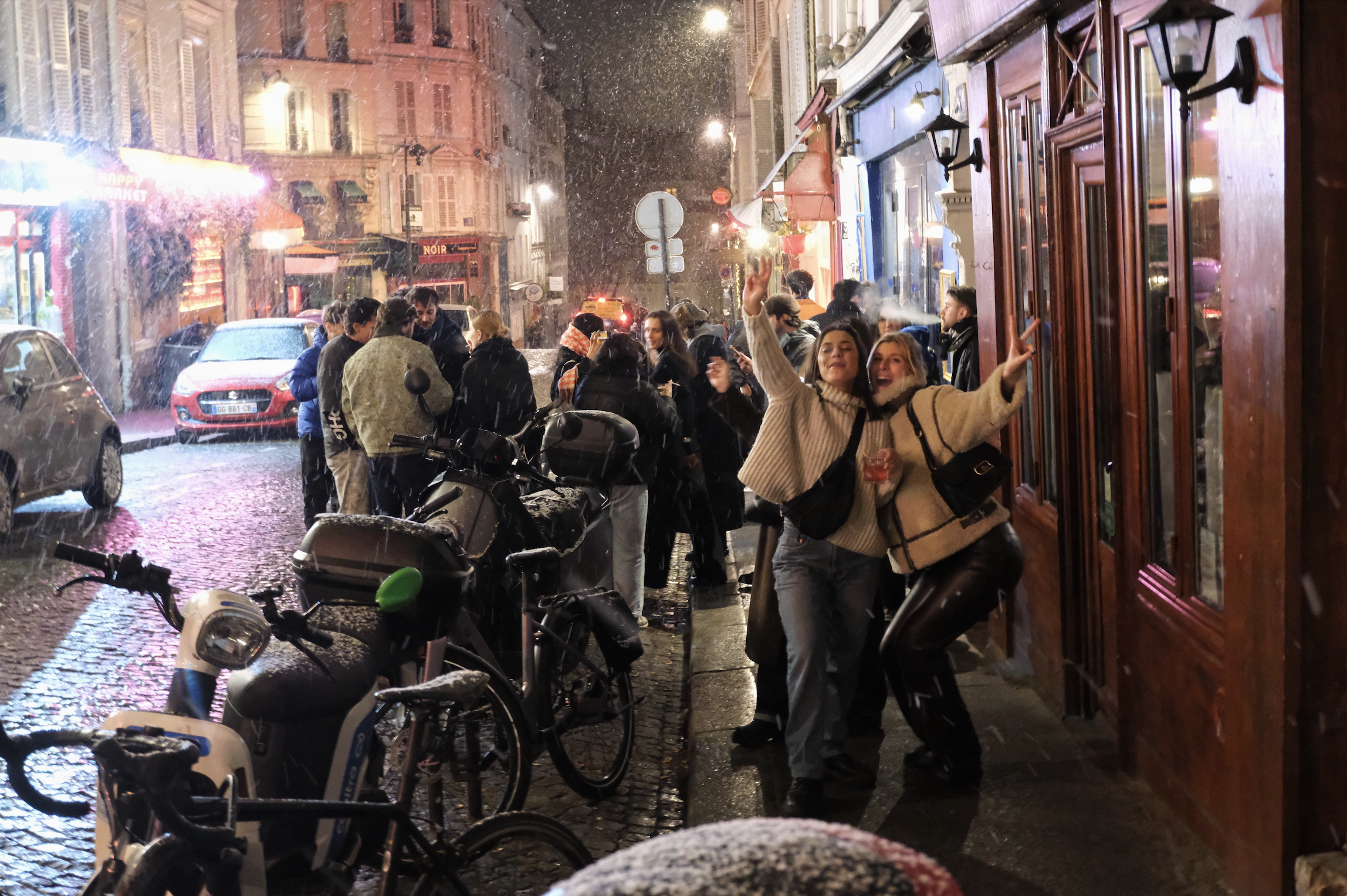 I stayed up and had been going outside every half hour or so to check on progress. There I was, on a cobblestone street, at 11.47pm, as I used the Christmas lights as a lens to make out the tiniest first flakes. Then it came down, hard and fast, and caught me so by surprise I had to run inside and put a water resistant coat on over my other layers. People in bars ran outside and said words to the effect of il neige! and the joy was utterly infectious. Even the French care!