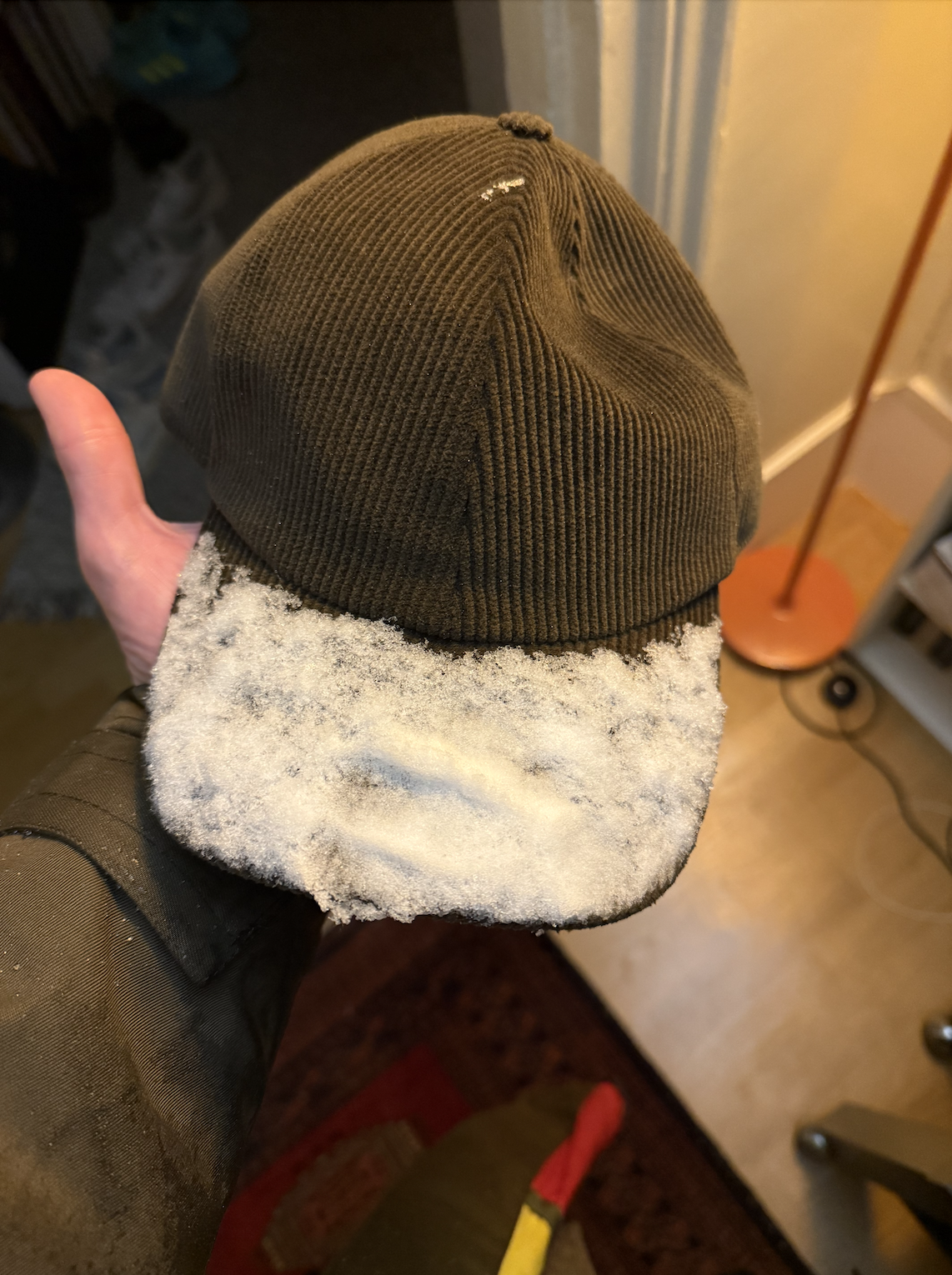 When I returned home I shook off my overcoat and walked up to my apartment and removed my hat.
