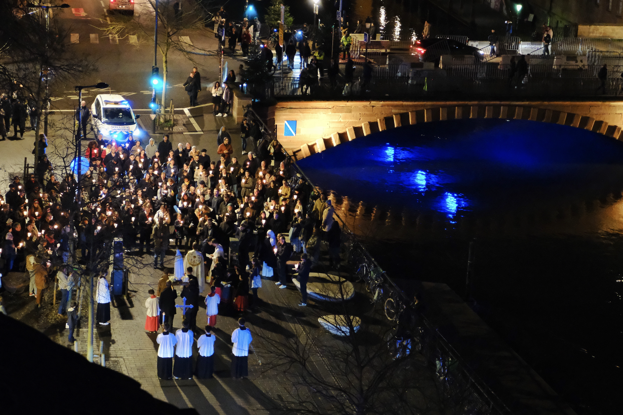 In the event I was determined to enjoy myself by nightfall and walked around town sipping from my new favourite drink in the world, vin chaud blanc (hot white wine), before I developed a sudden craving for spätzle and schnitzel that I haven't had since German studies in high school. Fed, watered and sleepy I returned to my apartment above the city and was half reading more of the Ombudsman's report and staring blankly at the wall when I heard the sound of distant singing. I paid it no heed until it grew louder, quite clearly on the move. When I reached my window overlooking the Ill River that surrounds the old centre of Strasbourg, I could make out a kind of liturgical chanting and my heart quickened. Why does this keep happening to me?