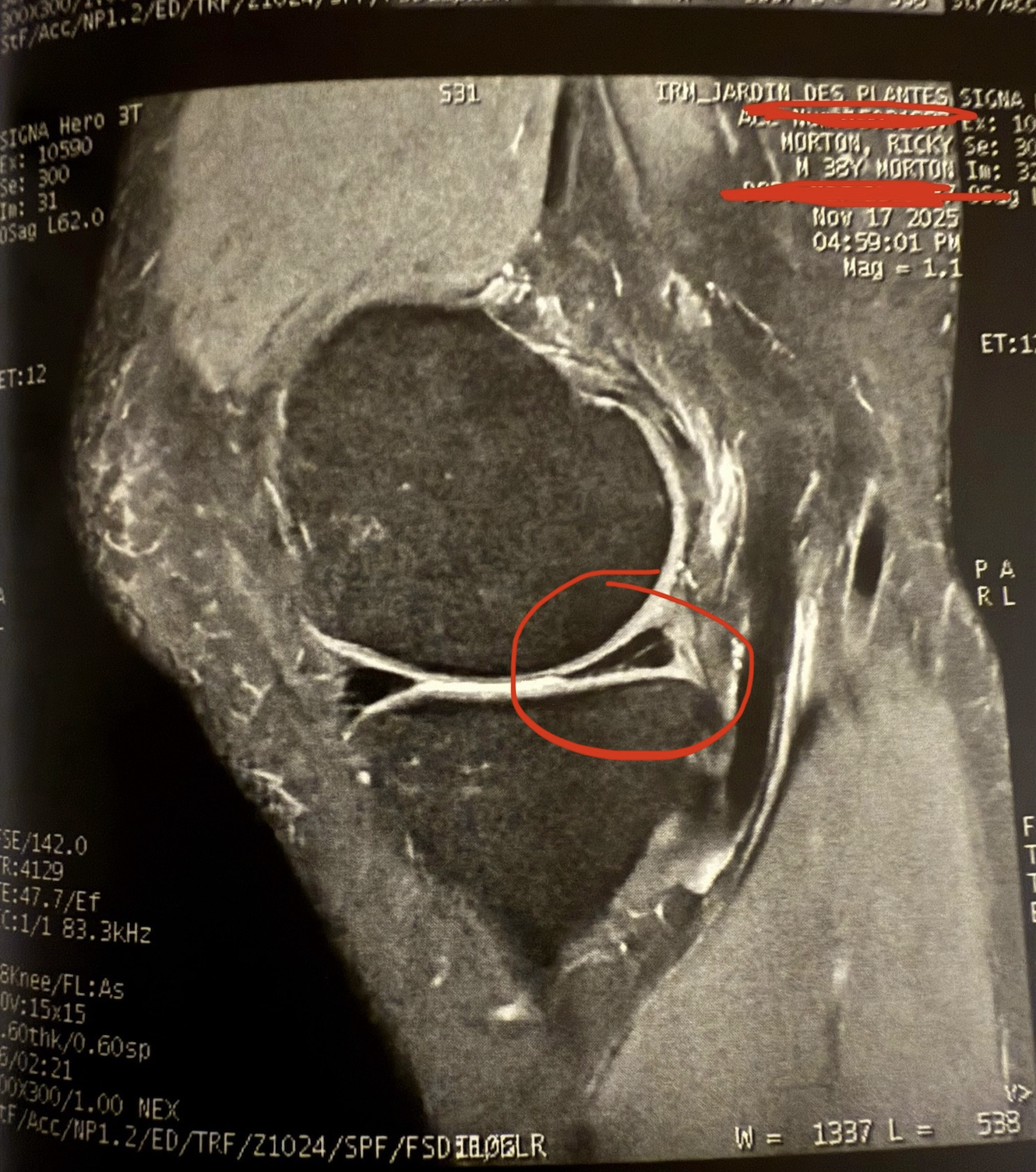 Terrible word, meniscus. The construction itself sounds like it could come apart at any moment. I can't explain this any other way except to say the word feels like two railway cars with defective coupling and it is a miracle that the two parts are even joined. How appropriate, then, that my knee has come apart. Officially. I mean, we already knew I was injured – and I am deeply sorry to write about it again, for the second time in a row – but now I knew I was injured and the knowledge was undeniable because it came with photos.