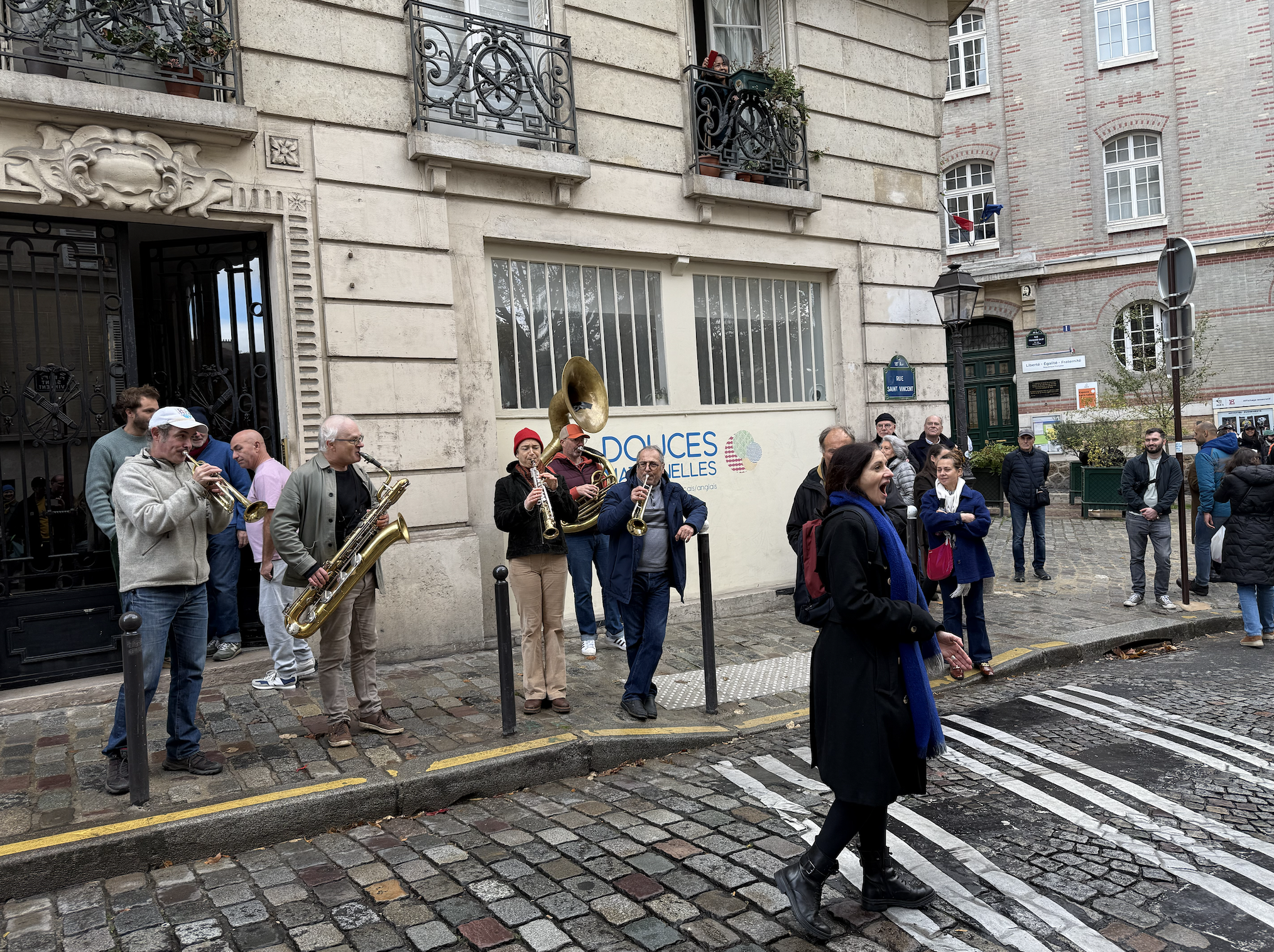 On the first weekend of November it was a misting, cold day with patches of blue sky appearing between sweeping grey clouds. I left my regular coffee shop and embarked on my routine circuit of the Montmartre butte via my daily bread, pain au chocolat. Halfway around the hill I heard the distant jangle of the brass instruments and the voice of a soprano filleting the air. I followed both like Pepé le Pew on the trail of an indecent musk and there, by the side of the road, was a troupe of performers. Oh they were fun: jumping in passing cars with trumpets and saxophones blaring, forcing a public bus to stop and open its doors so the tuba player could run down the aisle.