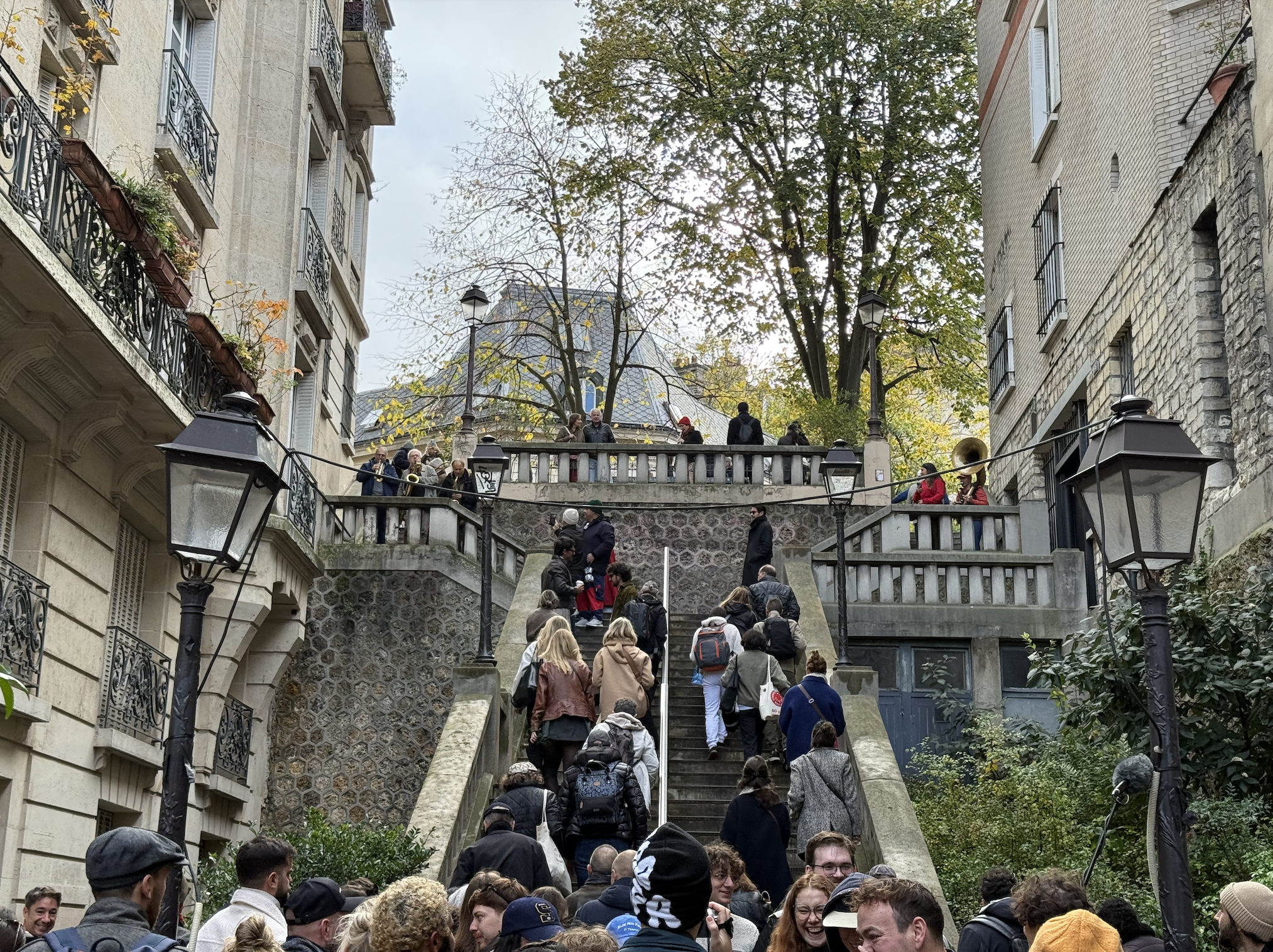 So when they changed location, the now not insubstantial crowd moved with them, up the nearby stairs and next to the rubbed raw bronze breasts of Dalida where the performance continued apace.
