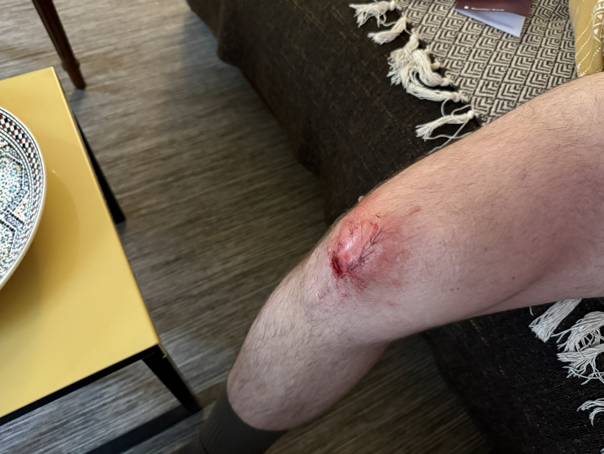 'You should sit down here,' one of the lovely women told me and I said no, no I can walk even though that remained to be seen. And the remains of my knee could not be seen. I rejected other offers of support, because I am ultimately still a man from regional Australia with a deeply embedded knot of recalcitrant pride, and eventually faltered around the corner, out of sight of others, where I inhaled sharply and considered my options. I was on the other side what I will now call a mountain from my home, so had to hobble the long way around to avoid as many stairs as possible – another 2km almost – and only when I made it to my apartment was I able to assess the damage.