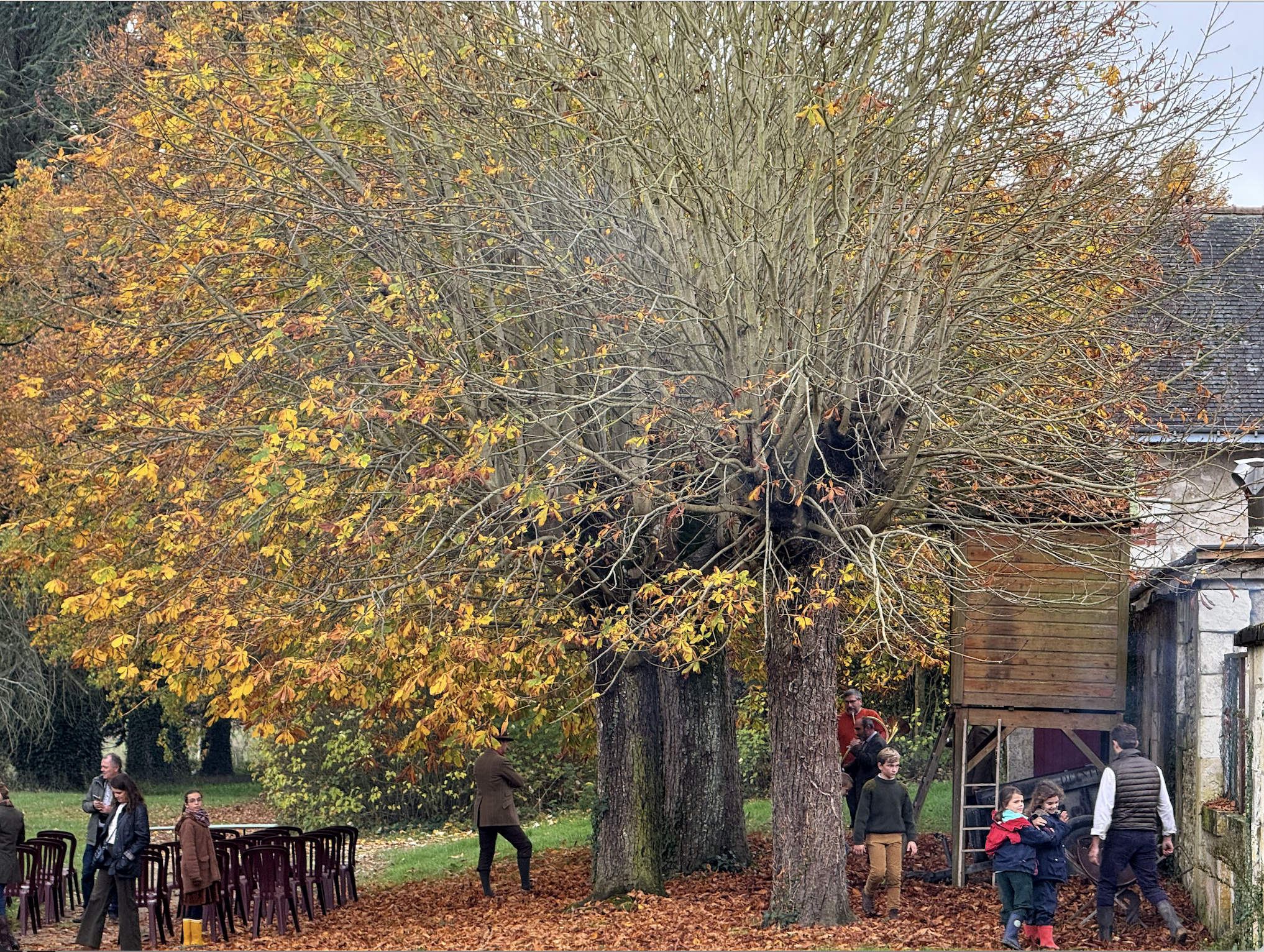 I ventured out to see what was happening and wandered into the middle of an 18th century traditional hunt, la chasse à courre, taking place right there on the castle grounds by our lodge. The château is owned by a family that still lives there and who apparently do not divert from their customs when 13 strangers are staying nearby. And the hunters were wandering in after practice shots in a nearby field to get ready for the official start of proceedings, for indeed, there were proceedings. One must always do admin here.