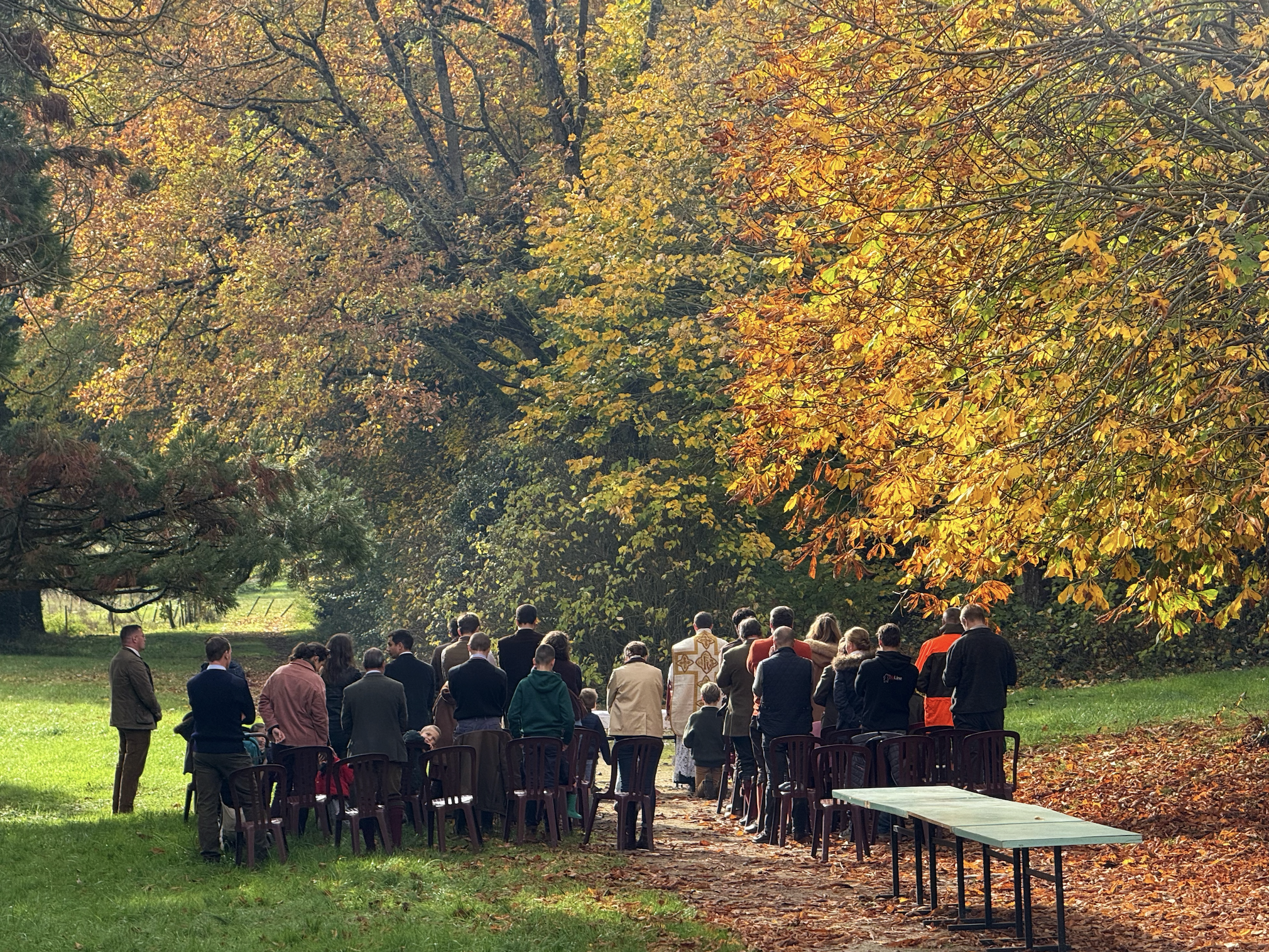 Shortly after we'd returned, Guillaume messaged the group chat to announce that the ceremony was taking place outside. It was a full Catholic mass, in Latin, held outdoors by what looked like a bishop but I suspect was a priest in high adornment. I later discovered this is called a Saint Hubert Mass and is often traditionally held at the start of November to bless the dogs in the hunt before what is ominously terms the 'honours to the wild boar'.